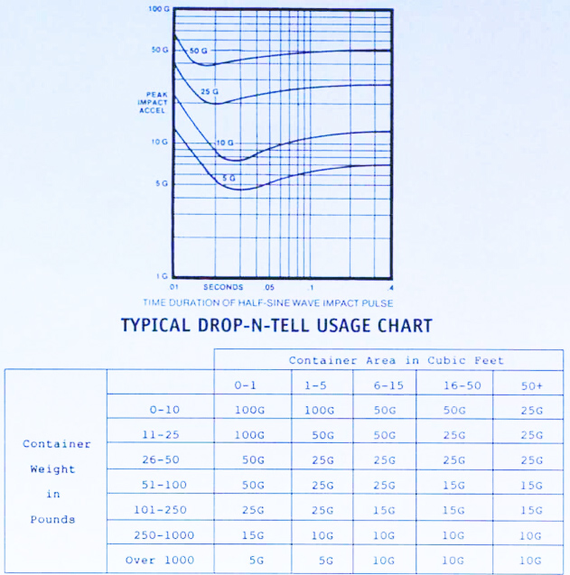 The chart shown above should be used only as a basic guide. DROP-N-TELL activation depends upon the type and amount of cushioning used to protect a product in transit . Drop height will also affect activation.