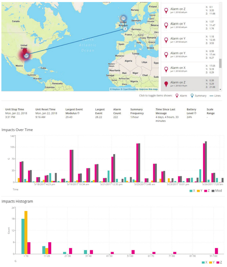 SpotSee云是實時行程數(shù)據(jù)匯集的平臺。這些圖表易于閱讀,包括位置、隨時間變化的影響、柱狀圖和溫度等數(shù)據(jù)。